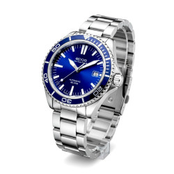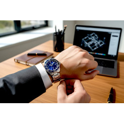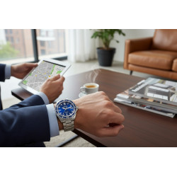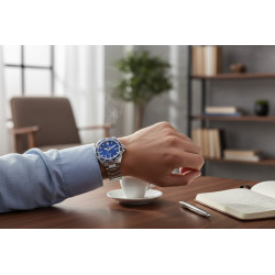 Model 3438 to idealne połączenie sportowego charakteru i wyrafinowania. Wyróżnia się **granatową tarczą** ze szlifem słonecznym, która pięknie kontrastuje z masywną, srebrną bransoletą ze stali szlachetnej. Tarczę otacza jednokierunkowy, obrotowy bezel, niezbędny do bezpiecznego odliczania czasu zanurzenia. Średnica koperty 41 mm jest optymalna dla komfortu i czytelności.