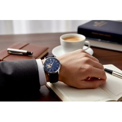 - Pasek: wysokiej jakości niebieski skórzany pasek ze stylowym przeszyciem