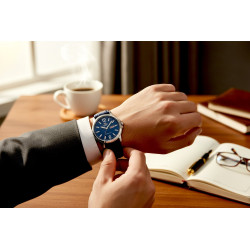 Zegarek RA-AA0C05L39B zachwyca swoim eleganckim wyglądem, inspirowanym ponadczasową estetyką. Koperta ze stali nierdzewnej o średnicy 42 mm i grubości około 11 mm prezentuje się solidnie, a niebieska tarcza z subtelnym szlifem słonecznym i fluorescencyjnymi wskazówkami emanuje głębokim urokiem. Datownik na godzinie 3 z funkcją dnia miesiąca zwiększa użyteczność, a niebieski skórzany pasek o szerokości 20 mm zapewnia komfort, pasując do nadgarstków o obwodzie do 210 mm.