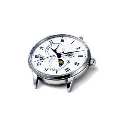Zegarek RA-AK0008S30B na zdjęciu prezentuje się oszałamiająco z elegancką, białą giloszowaną tarczą, 3D, która mieni się subtelnym wykonaniem. Koperta ze stali nierdzewnej o średnicy 42,50 mm i smukłej sylwetce przyciąga wzrok, a rzymskie cyfry dodają luksusu. Komplikacja Sun & Moon na godzinie 4, z obracającym się dyskiem słońca i księżyca, tworzy fascynujący efekt. Czarny skórzany pasek z fakturą krokodyla pięknie kontrastuje z tarczą, a przejrzysty dekiel odsłania pracę mechanizmu, co czyni go prawdziwą perełką dla kolekcjonerów.