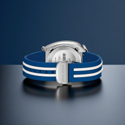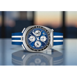 Zegarek 98B452 to rasowy towarzysz sportowy. Jego szeroka na 43 mm koperta w kształcie poduszki (Cushion) wykonana jest ze stali nierdzewnej z matowym i polerowanym wykończeniem. Wyraźna niebieska tarcza pięknie współgra z niebiesko-białym kauczukowym paskiem, zapewniając wysoki komfort noszenia i sportowy charakter.