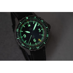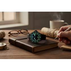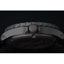 Koperta z wysokogatunkowej stali 904L o ciemnym, piaskowanym wykończeniu gwarantuje ponadprzeciętną odporność na korozję, uderzenia i warunki atmosferyczne. Zastosowanie miękkiego żelaza (soft iron) pod tarczą zapewnia skuteczną ochronę antymagnetyczną, a dwustronne powłoki antyrefleksyjne na szafirowym szkle podnoszą czytelność w każdych warunkach oświetleniowych. Obrotowy bezel z ceramiczną wkładką i luminescencją Super-LumiNova C1 zapewnia pełną funkcjonalność w dzień i w nocy.