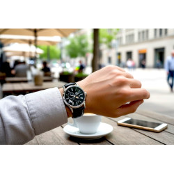 - Czarna tarcza z subtelnymi detalami, w tym rzymskimi cyframi, które nadają zegarkowi klasyczny charakter.
